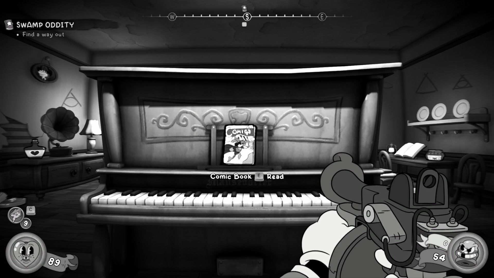 Entra a la cabaña y habla con la anciana. Dirígete a la siguiente habitación, derrota a los enemigos y atraviesa la puerta de la Sala de Música. Coge el cómic que está en el piano.