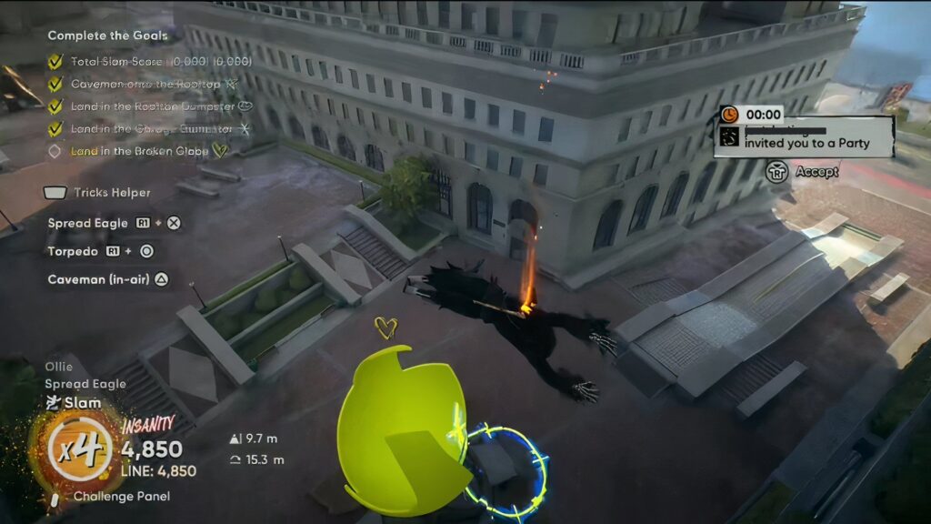 La siguiente etapa del desafío es aterrizar en el contenedor de basura. Nuevamente, los jugadores deberán patinar la azotea curva. Luego, deben pasar el contenedor de basura y caer en el agujero que conduce dentro del estacionamiento.